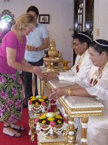 Then ten saffron-robed monks arrived to sing mantras for an hour while passing a long thread between them; the forty or so guests could contemplate during the rhythm of the chanting, which I found quite uplifting, or dip in and out, take photos and gossip! The later, very swish, reception for hundreds of beautifully clad people, took place in the Palace Gardens on the banks of the River Chao Phraya and we were the only Europeans present, but of course they all spoke English.
