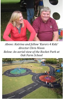 Katrina’s original motivation came from dealing with her daughter Emma who was born with cerebral palsy. Despite Emma’s illness, she was able to attend local schools and, now aged 20, is attending a residential college. Thanks largely to Katrina’s drive, two years ago Emma’s primary school, Oak Farm in Hillingdon, was provided with the purpose-built ‘Rocket Park’, complete with a yo-yo swing, roundabout and slide all suitable for use by those with disabilities. There are picnic tables and specially designed roads so that wheelchairs users can practise their wheelchair skills.