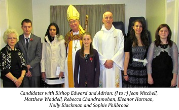 St Giles’ was full to witness the Confirmation Service last month, conducted by the very friendly Bishop Edward Holland. There were five candidates for Confirmation (Jean, Holly, Rebecca, Sophie and Eleanor) and two (Sophie and Matthew) for Baptism.