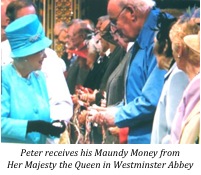 MAUNDY MONEY FOR PETER The day before Good Friday is called Maundy Thursday. On this day, Jesus ate the Last Supper with his disciples, then washed their feet as an act of humility and love, and commanded them to love one another as he had loved them. The word Maundy is derived from the Latin ‘Mandatum’ meaning Commandment. It became the custom in the 13th century for royalty to recall this simple act of humility by washing the feet of their citizens but, by the eighteenth century, the process had been replaced by the Monarch’s distribution of money to the ‘deserving poor’. Despite this change, the practice of carrying nosegays of sweet smelling herbs and flowers during the ceremony (originally to offset the odour of once smelly feet) still persists! The tradition continues to this day, with our current Queen distributing this ‘Maundy Money’, now to a group of recipients chosen by local churches, in recognition of their service to the church and the community. Each year, there are as many recipients as there are years in the Monarch’s age, and each receives that number of pennies in their Maundy purse.