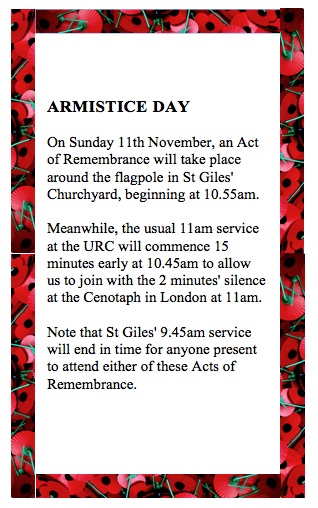 DROP-IN FOR THE BEREAVED. Third Monday of each month. St Giles’ Church Hall, 2pm to 3.30pm. A friendly, informal opportunity for a chat, over a cup of tea, with other bereaved people and bereavement visitors. The next meeting is on Monday 19th November (then Monday 17th December). Just come along, or ring the Rectory (622970) if you would like to talk to someone first. |