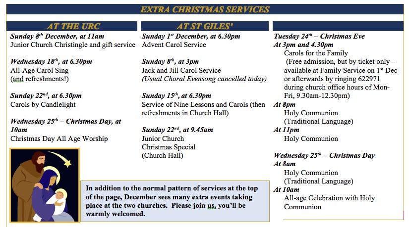 This month, why not give yourself a treat? Come and find that real gift. Put aside your lists for a while and come and join in one of our services of celebration. There is something for everyone: traditional carol services; family worship; nativity scenes - all at different times and days. So come and join us as we welcome the angels’ songs again.